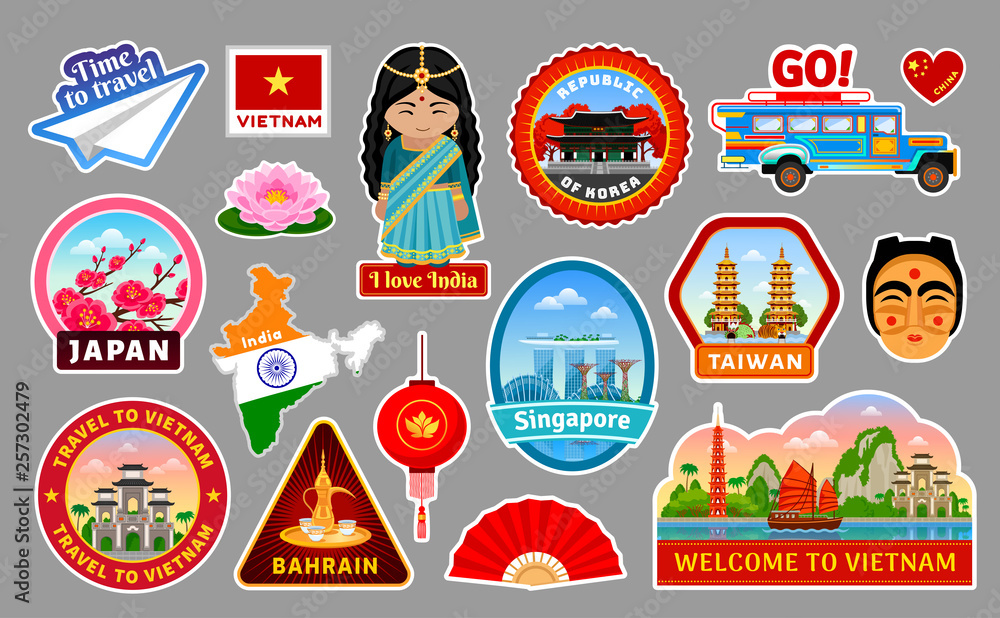 Big Collection Of Travel Stickers Symbols And Landmarks Of The Asia Taiwan Vietnam China Japan Korea And Australia Indonesia Singapore Philippines Bahrain And India Vector Illustration Set Stock Vector Adobe Stock